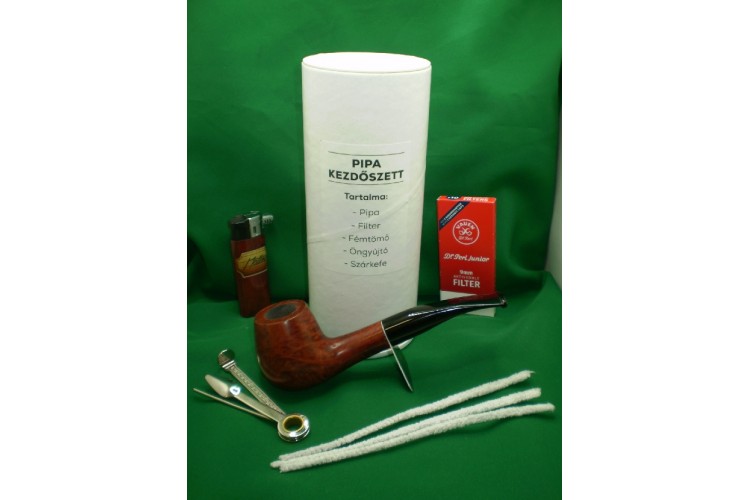 Tartalma: bruyer pipa, háromfunkciós fémtömő, 3 szál pipatisztító szárkefe, 1 doboz 10 darabos kiszerelésű 9 mm-es Dr. Perl Junior aktívszén szűrő, 1 db pipaöngyújtó.
