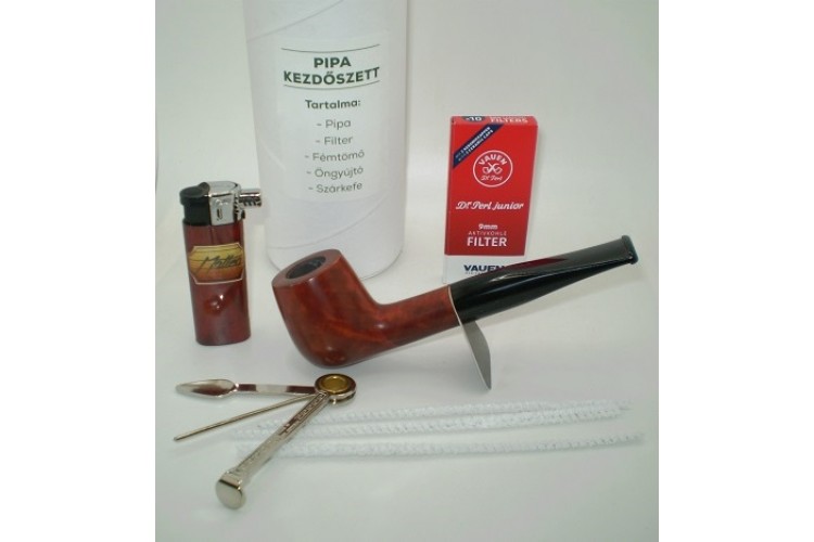 Tartalma: bruyer pipa, háromfunkciós fémtömő, 3 szál pipatisztító szárkefe, 1 doboz 10 darabos kiszerelésű 9 mm-es Dr. Perl Junior aktívszén szűrő, 1 db pipaöngyújtó.
