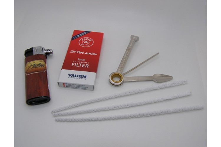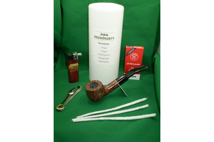 Tartalma: bruyer pipa, háromfunkciós fémtömő, 3 szál pipatisztító szárkefe, 1 doboz 10 darabos kiszerelésű 9 mm-es Dr. Perl Junior aktívszén szűrő, 1 db pipaöngyújtó.